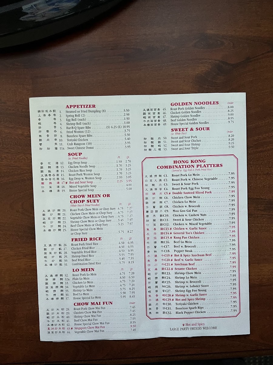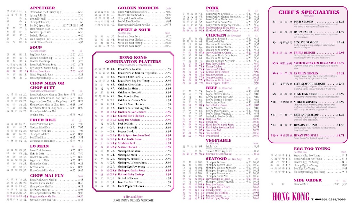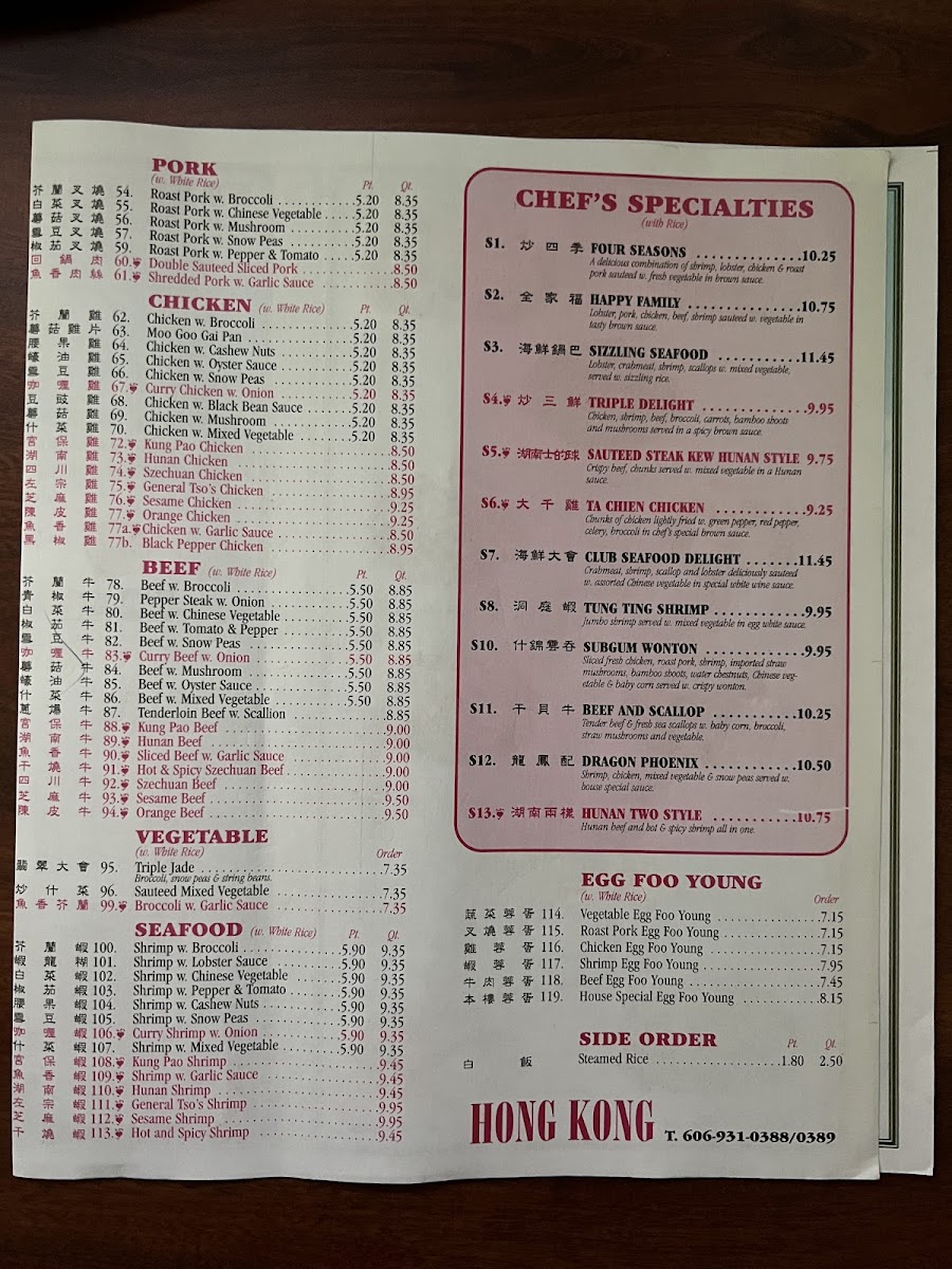 The menu at Hong Kong offers a thoughtful selection of classic Chinese dishes served in a comfortable, casual dining setting. It’s the kind of place where you can enjoy familiar favorites at any time of day—whether you're stopping by for a quick lunch, a relaxed dinner, or a convenient takeout meal.